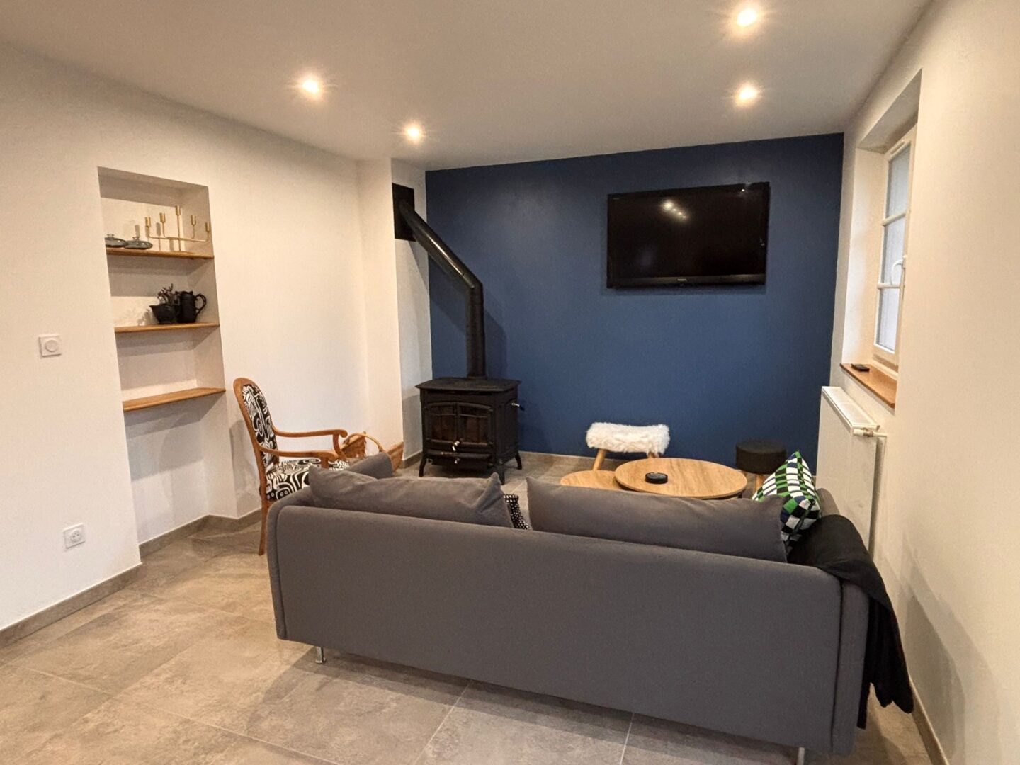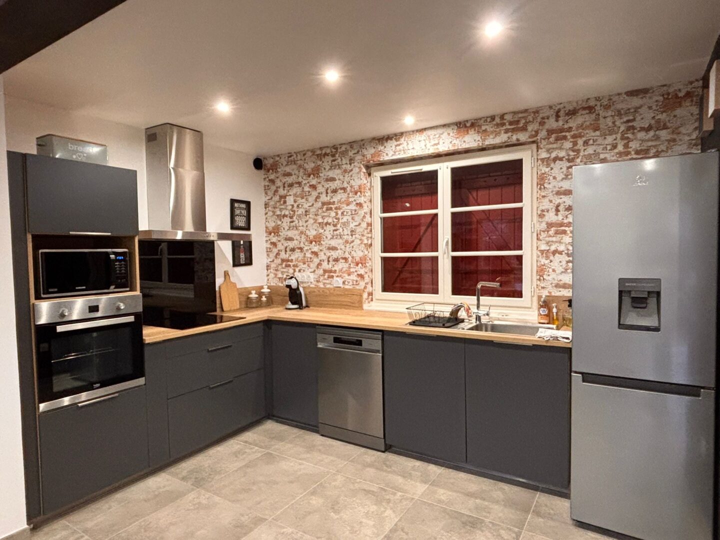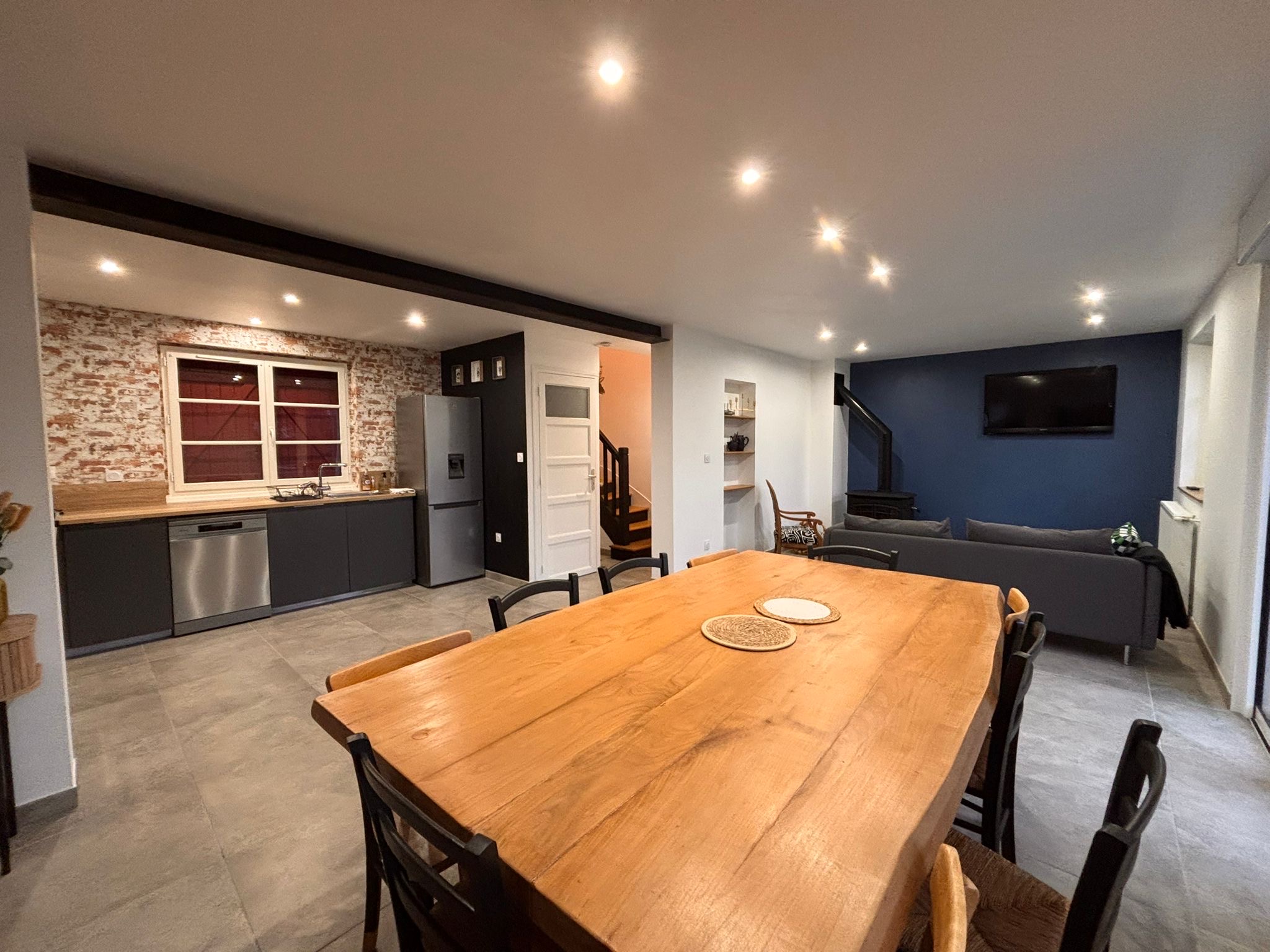 👉🏻 1 salon-séjour ouvert sur la cuisine (four, plaque de cuisson, micro-ondes, cafetière, lave-vaisselle…)